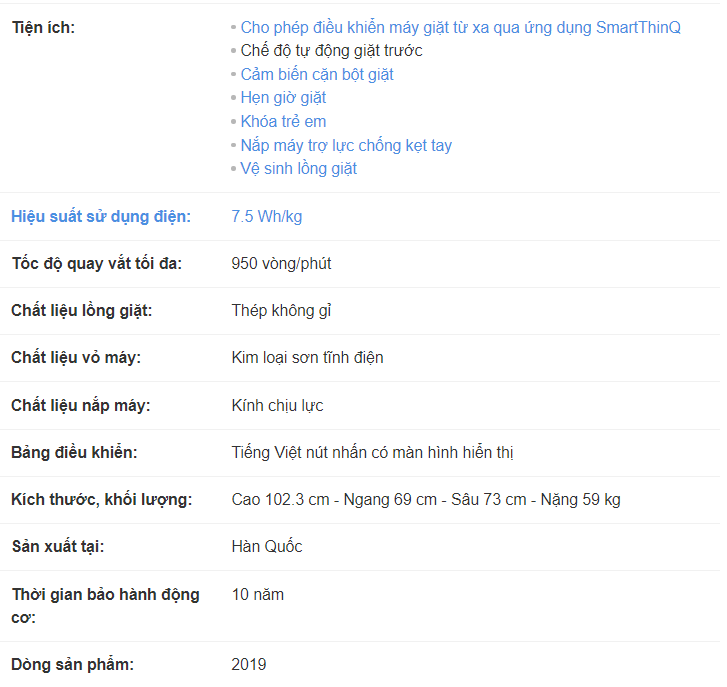 THÔNG SỐ KỸ THUẬT Máy giặt LG Inverter 22 kg TH2722SSAK