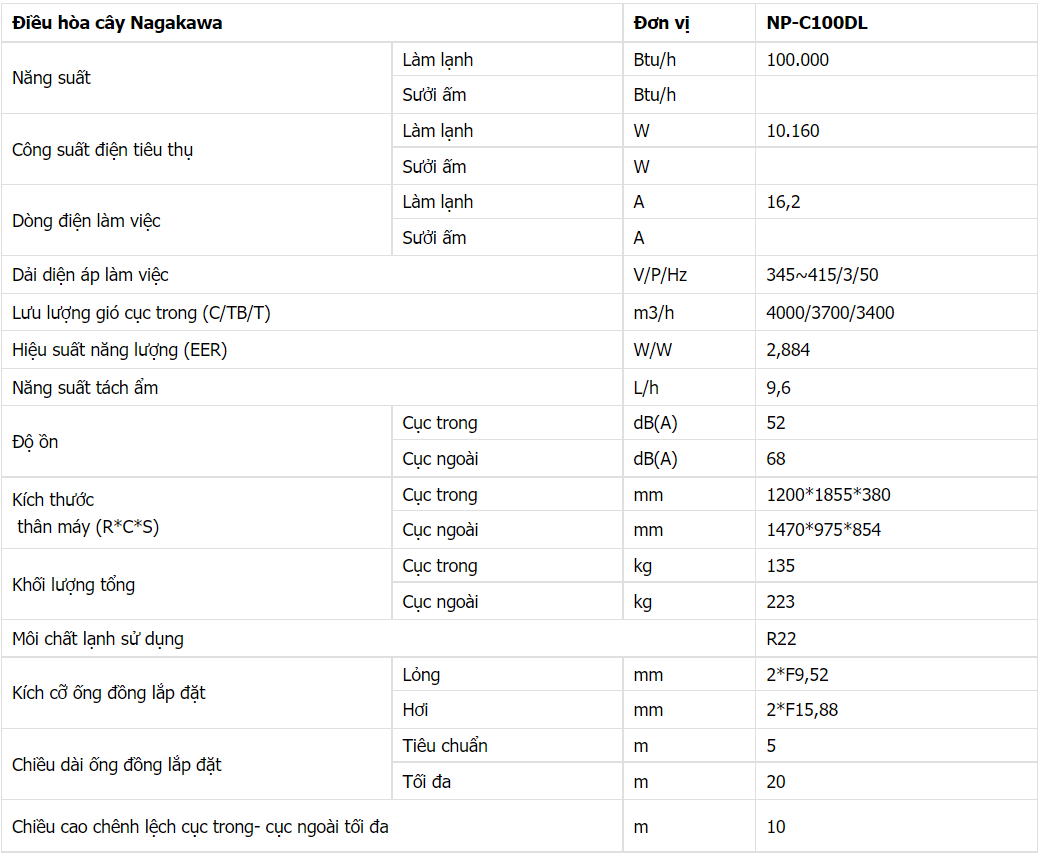 THÔNG SỐ KỸ THUẬT Điều hòa tủ đứng Nagakawa 100.000BTU inverter 1 chiều NIP-C100R1M15